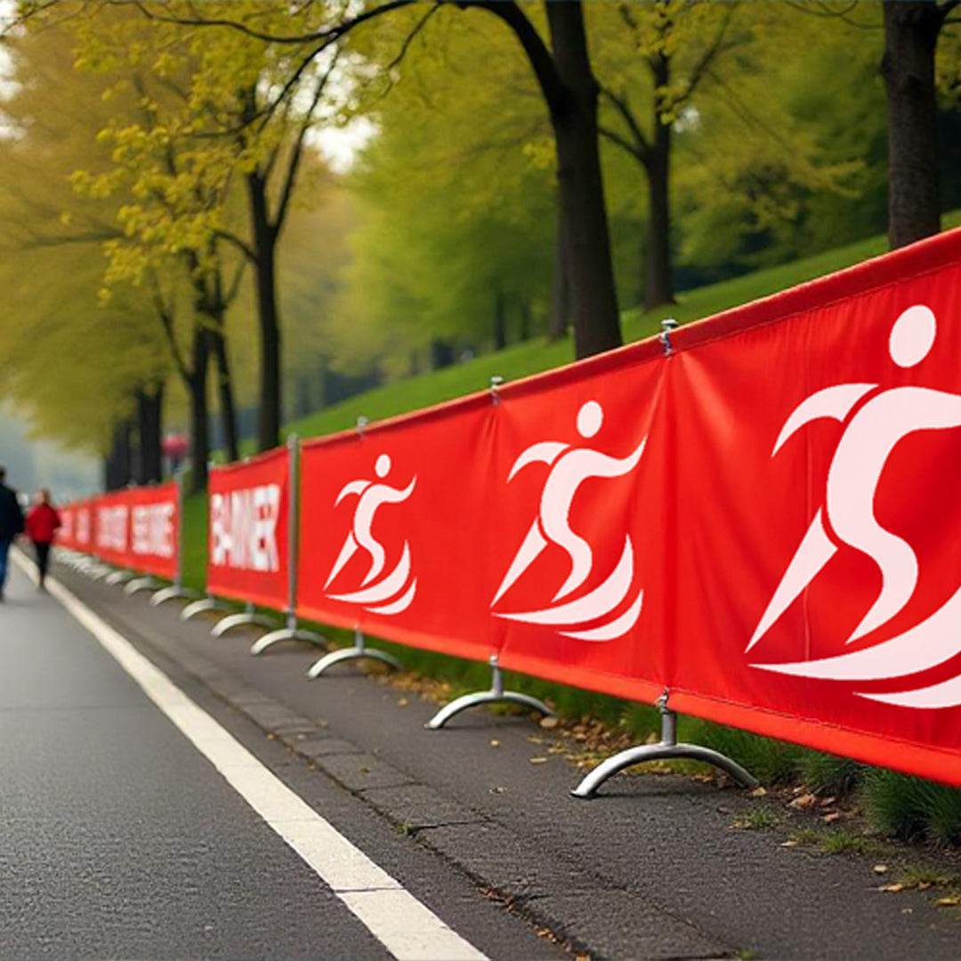 Unsere Banner sind standardmäßig gesäumt und mit optionalen Ösen versehen, sodass sie schnell und unkompliziert an Absperrgittern, Zäunen oder Bandensystemen befestigt werden können.