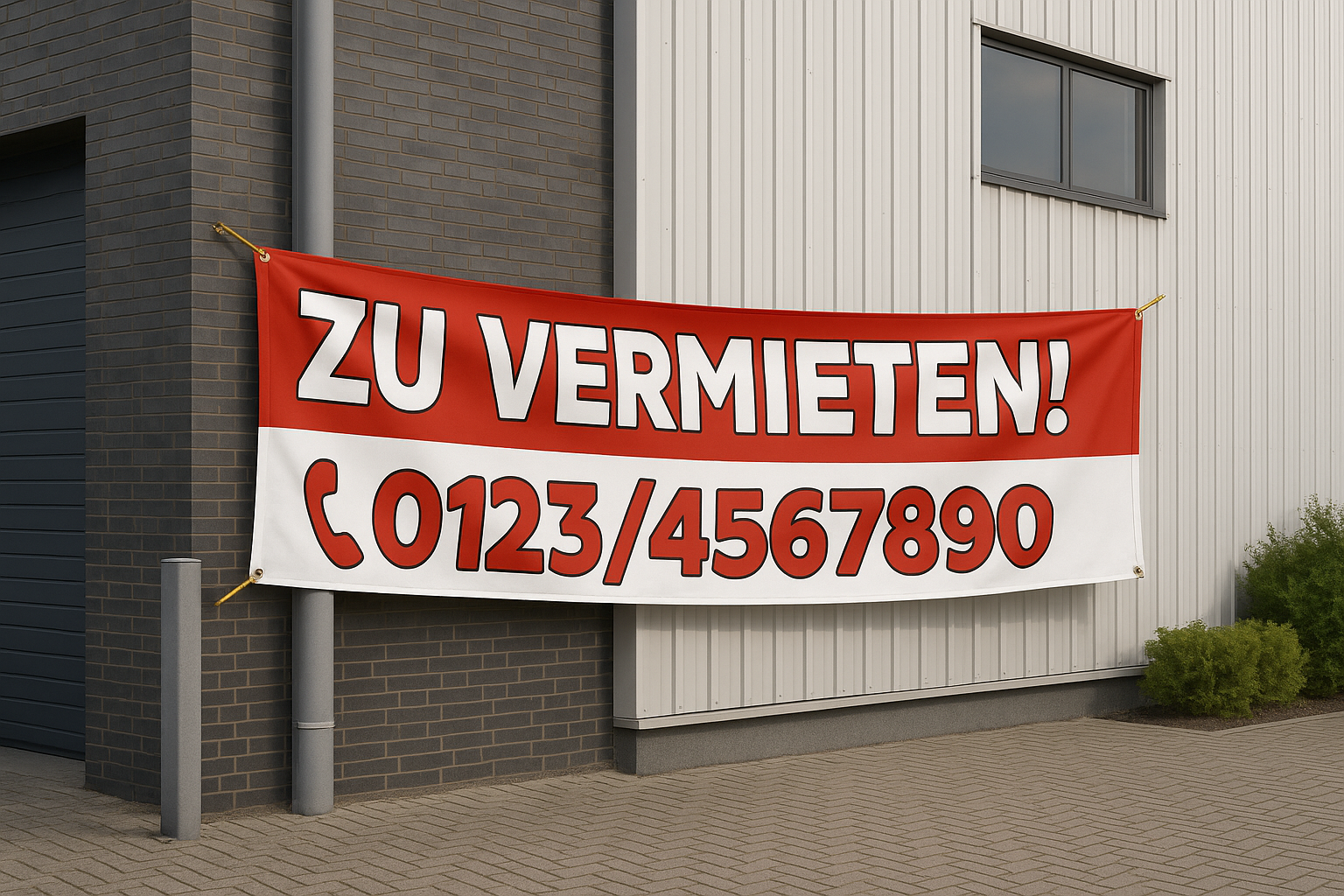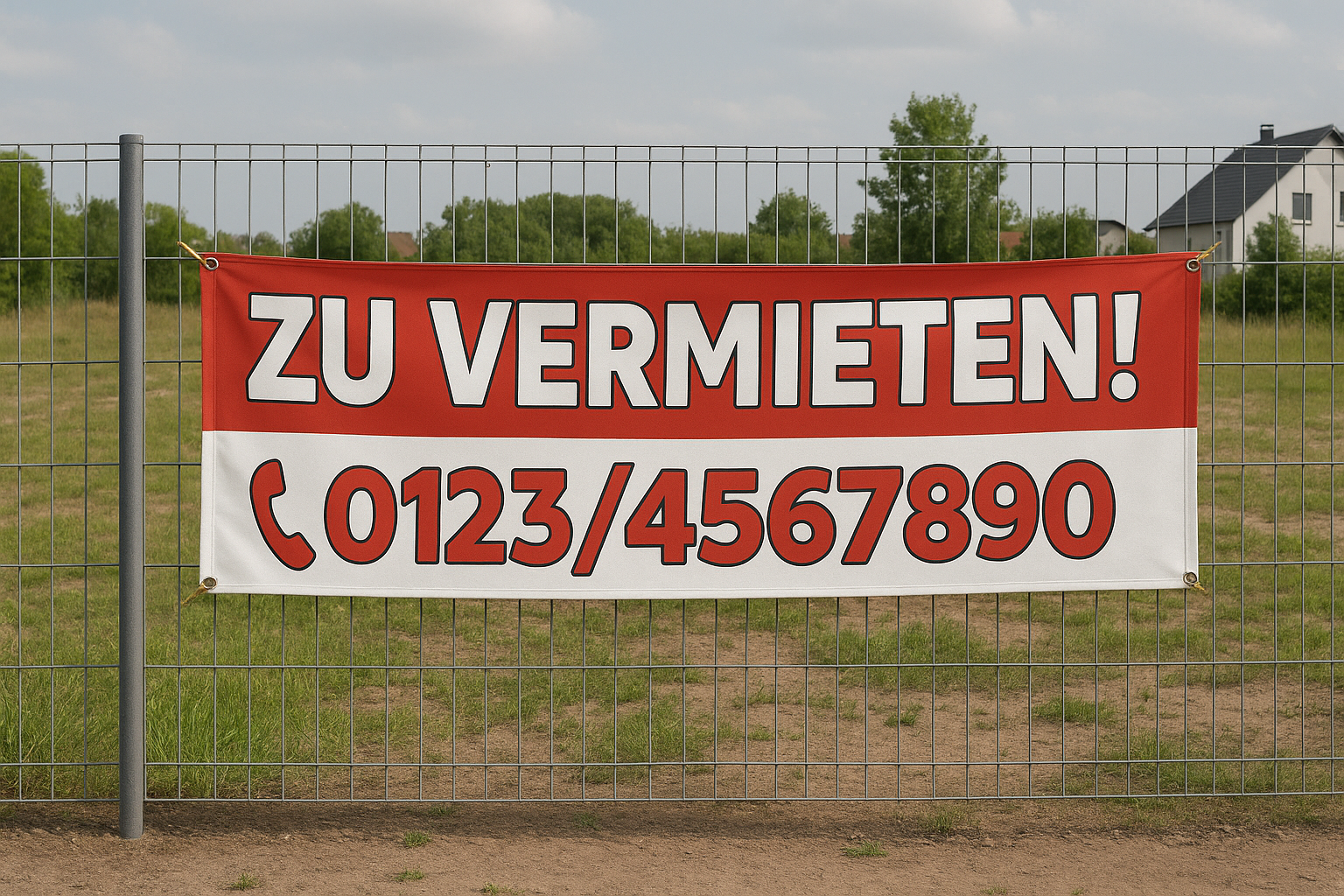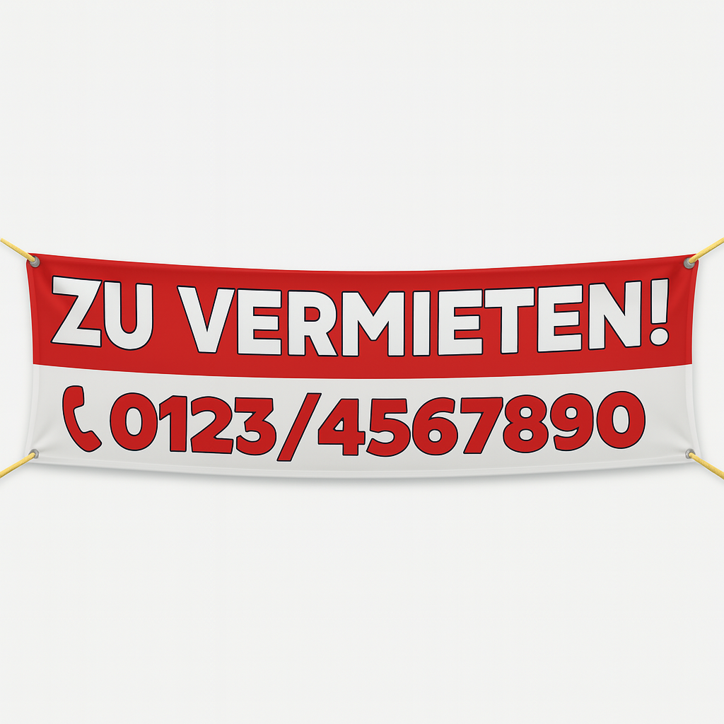 Wenn Sie einen Zu vermieten Banner mit Telefonnummer benötigen, möchten Sie vor allem eines: schnelle Aufmerksamkeit für Ihr Mietobjekt. Mit einem fertigen Banner, bei dem Ihre Rufnummer direkt integriert wird, lässt sich Ihr Angebot sofort erkennen. Dadurch erreichen Sie Interessenten ohne Umwege, weil der Banner sowohl gut lesbar als auch wetterfest ist.